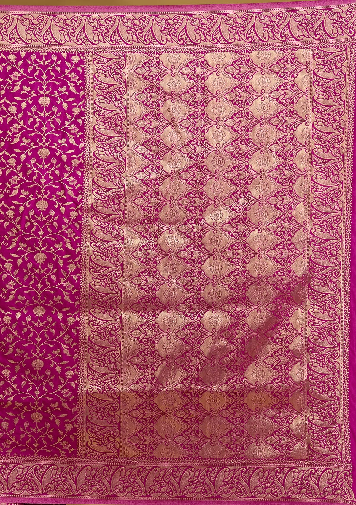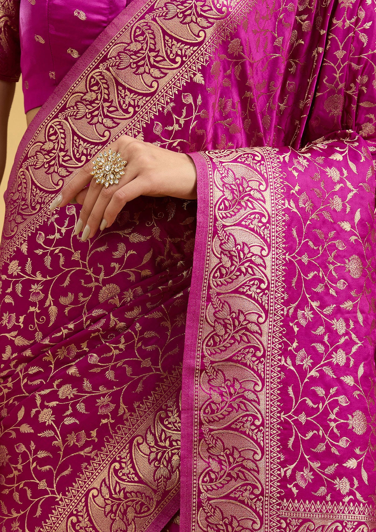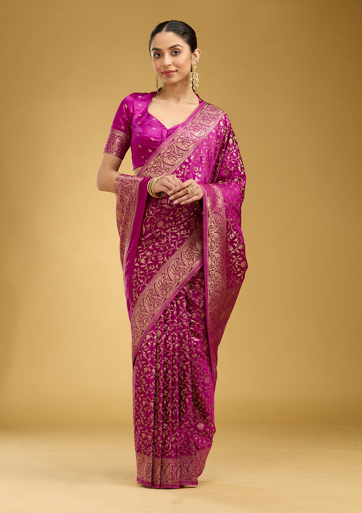 Violet Silk_Saree in Art Silk fabric. The Silk_Saree is elevated with Zariwork (Gold) embroidery. It comes with an Unstitched blouse. Comes with the Koskii promise of premium quality.