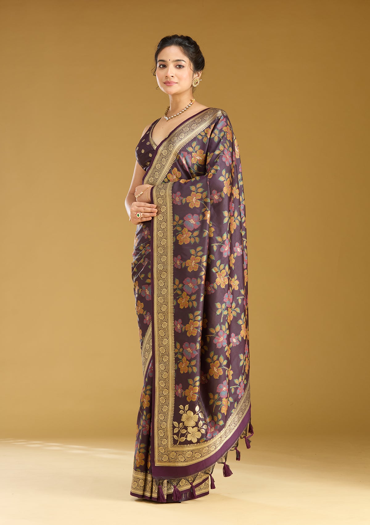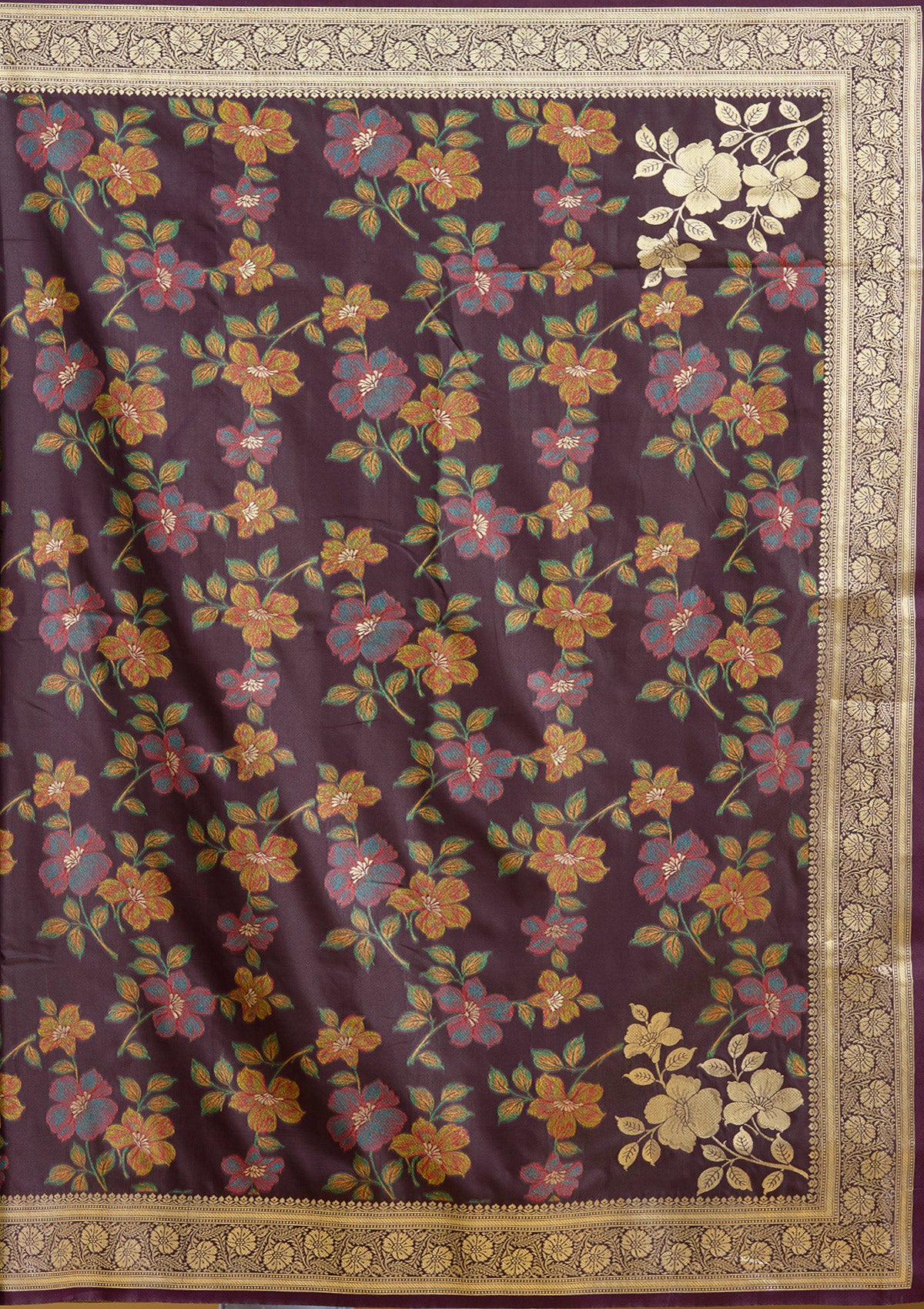 Wine Silk_Saree in Art Silk fabric. The Silk_Saree is elevated with Zariwork (Gold) embroidery. It comes with an Unstitched blouse. Comes with the Koskii promise of premium quality.